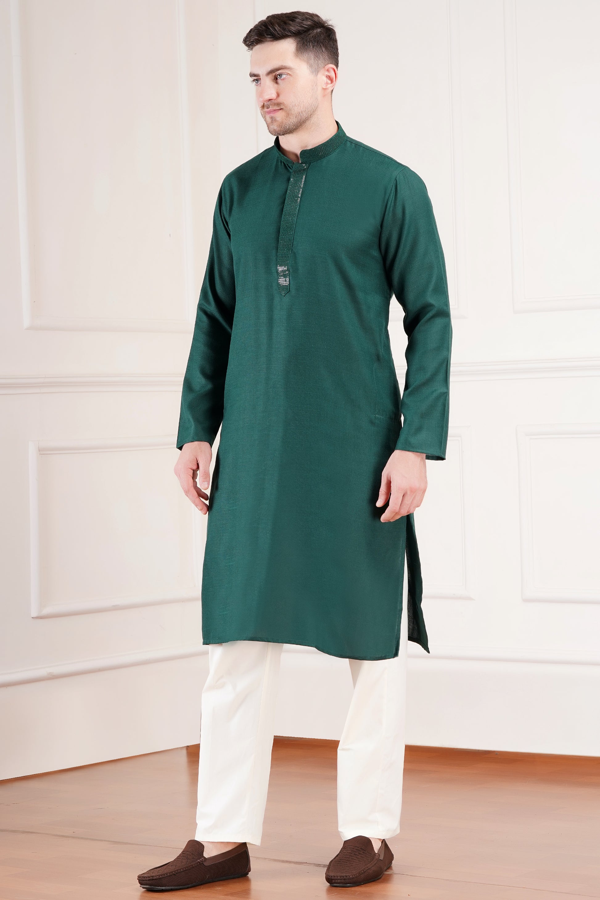 - FEATURE: Men's plain kurta. Mandarin collar, side pockets and full sleeves.